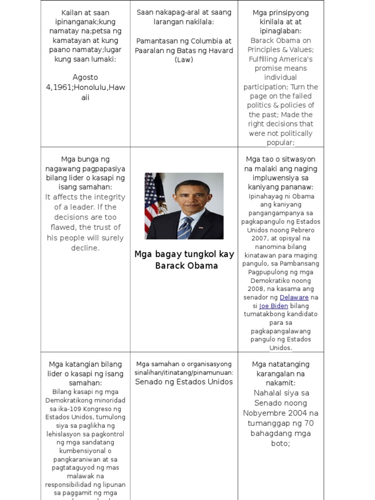 Ratings 100 7 7 out of 7 people found this document helpful. Si Barack Hussein Obama II ipinanganak 4 Agosto 1961 ay ang ika-44 na Pangulo ng Estados Unidos. Bakit c ano ang iyong tungkulin sa nabanggit na.